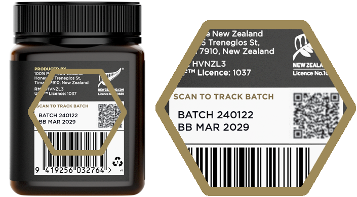 All honey packaging must have a batch number. This number can generally be found on the reverse of the label or in the shipment packing slip. An example of this can be seen below.
